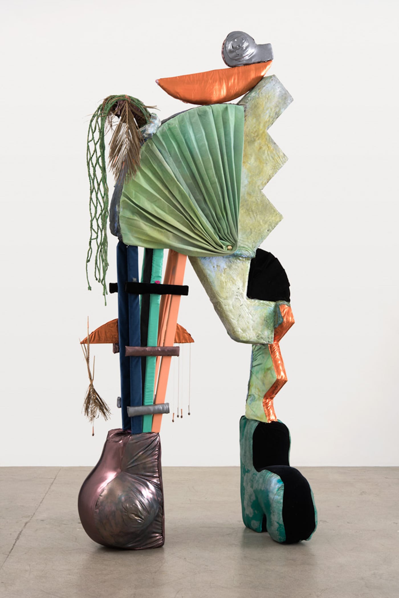 Tamara Henderson’s sculpture “The Scarecrow’s Holiday” (2015) confronted me with a sense of dystopia the moment I entered Vancouver Special. The towering figure of wood, metallic half-moons, textured fabrics, dried palm leaves, and rope appeared like a faceless robot made from scavenged materials. Behind it, a curtain of fabric pieces sewn together into tower-like forms evoked a ravaged skyline. Titled “Dreamstep, Drownedstep, Droughtstep, Fogstep” (2016) and set to an accompanying soundtrack of ominous steps and sounds composed by artist Dan Riley, it felt as if Henderson had set a physical stage for a pending apocalypse — a bold curatorial choice to frame the exhibition that occupies a full floor of the Vancouver Art Gallery. Beginning in such a dark place primed me to find similar themes among the works that followed.