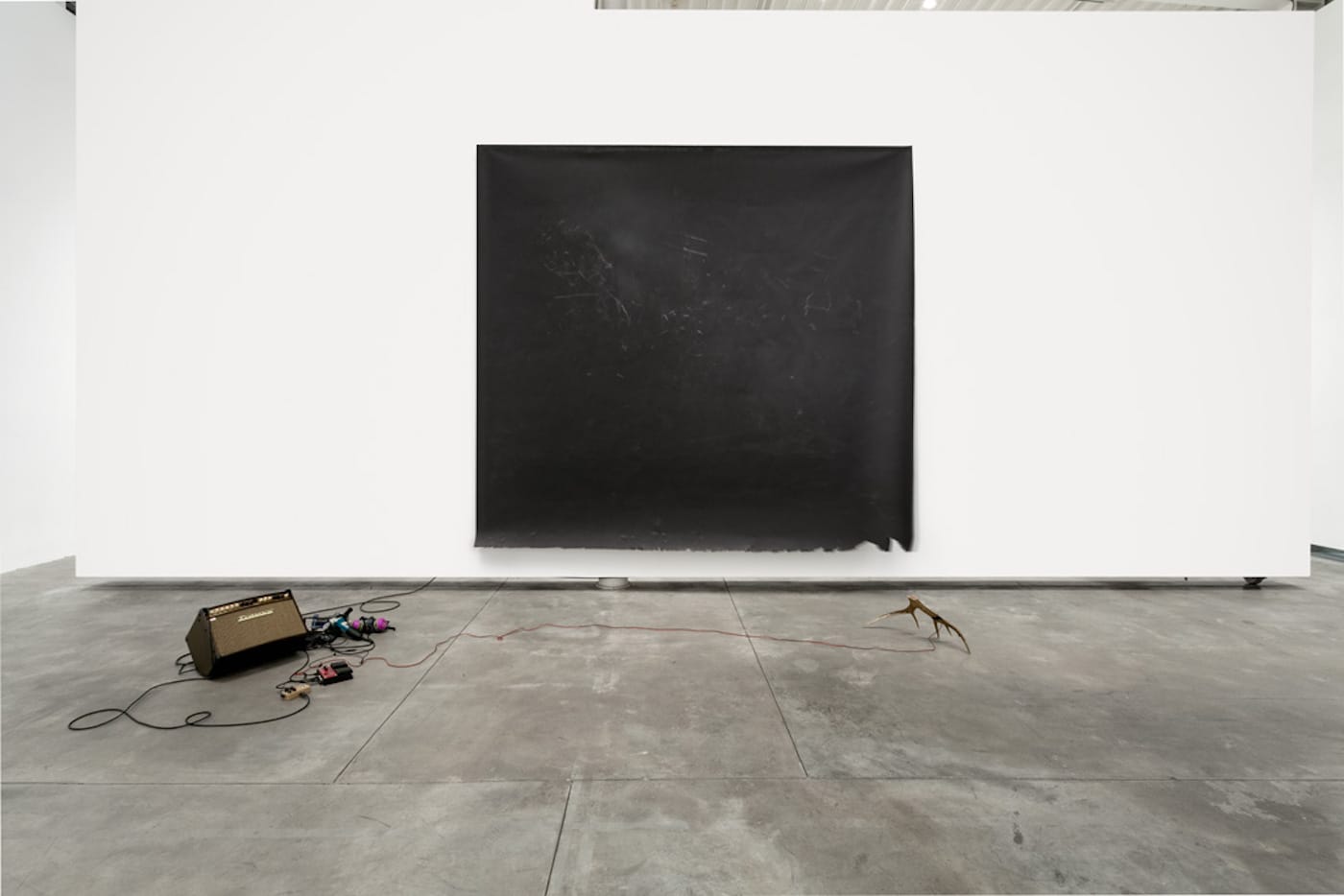 Meanwhile, Jeneen Frei Njooti actively rejects photography in her performance-based practice, in order to construct what she describes as the “sovereignty” of her image as a young Indigenous woman. This past December, the Vuntut Gwitchin First Nation artist performed “Through the Body. Where is the work? g’ashondai’kwa (I don’t know)” in the gallery using an amplified caribou antler and a metal grinder, wearing a black summer parka that captured the dust the grinder sent into the air. In order to leave a physical record of the piece, Njooti placed photo-receptive paper on the floor as she performed, capturing her movements in forms obscured by the darkness of overexposure. For the duration of the exhibition, an audio track from the original performance plays several times throughout the day, among the photo paper, antler, and parka, transforming the gallery through haunting sounds that are at once animalistic and otherworldly. The human behind all is it conspicuously absent except for threads of dust left clinging to her parka, quietly testifying on behalf of the events that took place.