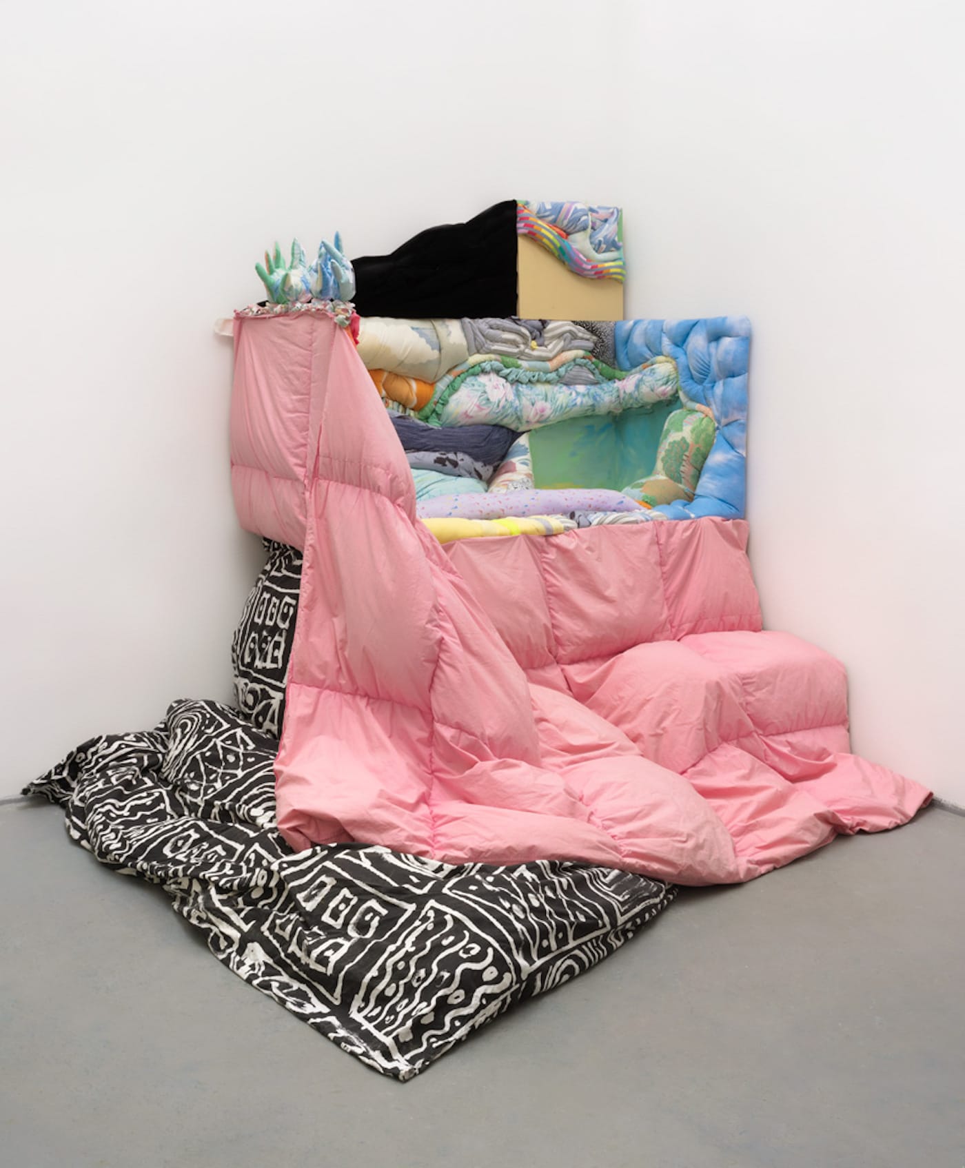 In a show dominated by textiles, paintings, installations, and sculpture, tangibility felt especially urgent, signaling a moment when physical evidence — of objects in the flesh, of promises made good, of ideas turned into actions — is necessary. Maya Beaudry’s bulbous blanket sculptures made of bright fabrics and pillow stuffing balloon out from the walls and corners of one gallery, reaching into our physical and emotional space. “Soft Place in a Soft Room (A Couch Is Like a Friend)” (2016) was warm enough to feel inviting yet disheveled in such a way that it appeared left behind. I couldn’t decide whether I wanted to curl up inside its blankets or leave them alone in hopes that their owners would be back to claim them someday. Matt Browning’s wall-mounted grid sculptures made of dowels the artist whittled from single pieces of wood to create interlocking grid structures adhered to a minimalist aesthetic, but the artist’s labor-intensive process is subtly indicated by the dowels’ lightly rigid textures: hard evidence of an ideal that resides behind the creation process and takes precedence over producing a flawless result.