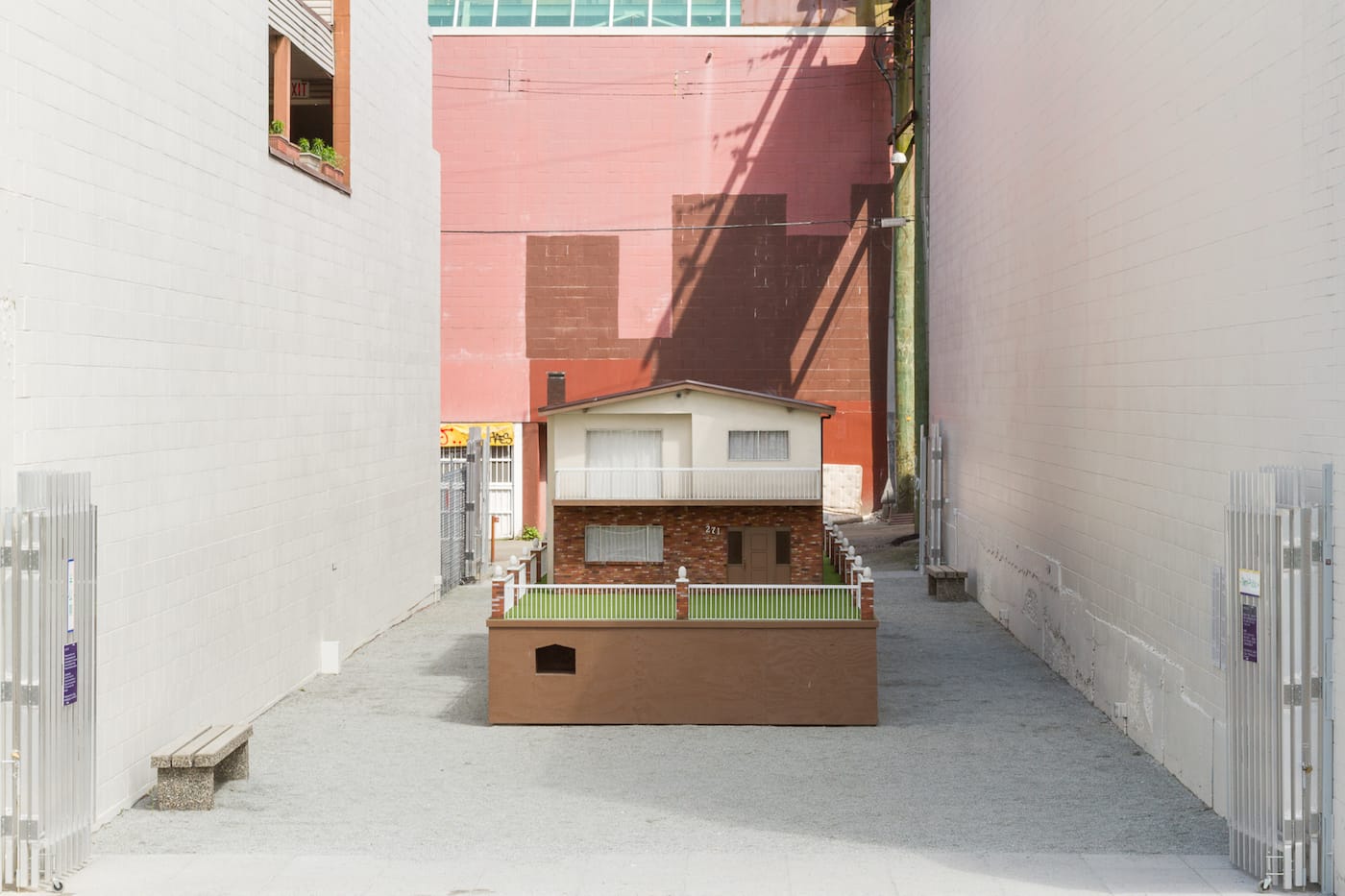 It turns out the Vancouver Special has its own complicated history, as I learned from a project by Ken Lum concurrently on view through artist-run space 221A. Lum’s 1/3-scale recreation of a house sits in a quiet alley in Vancouver’s Chinatown, dwarfed by brick commercial buildings on either side. The dollhouse-sized residence is overly picturesque. The smile of its balcony mirrors the friendly white fence that surrounds the Astroturf at its base. A side window reveals a bedroom lit by the warm glow of a miniature lamp with a landscape painting on the wall. Meanwhile, Lum’s loaded title introduces the darker reality that lives within this simple façade: “Vancouver Especially (A Vancouver Special scaled to its property value in 1973, then increased by 8 fold)” (2015).