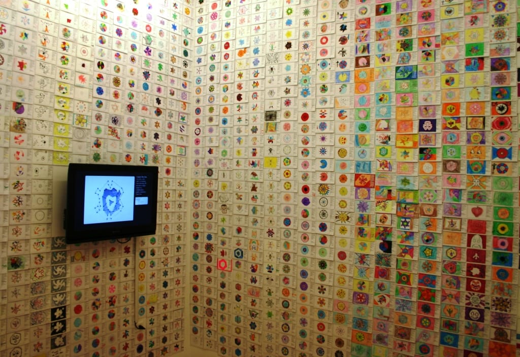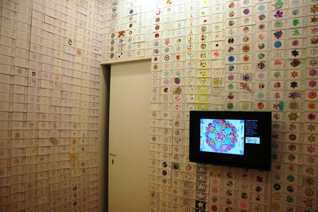 The resulting floor to ceiling installation is a testament to the universal pleasure of creative time. The most fantastic effect of the whole card plastered room is that its hard to, at first glance, distinguish the work of the fourth graders from the famous curators or NYC tourists.