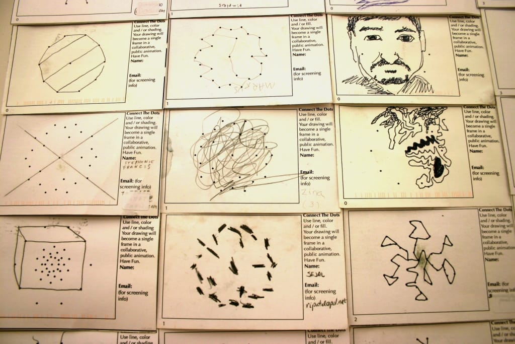 Her connect the dot themed templates provide a blank slate for individual art-making. Brown’s efforts are so interesting particularly because of their widespread reach. The artist distributed 1/3 of her cards to inside art world contact — curators, artists, gallerists… — and another 1/3 to New York Public School teachers, for use in art class. She slipped the final 1/3 of her cards into magazines and newspapers in newsstands around New York.