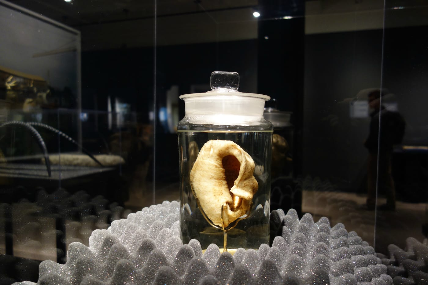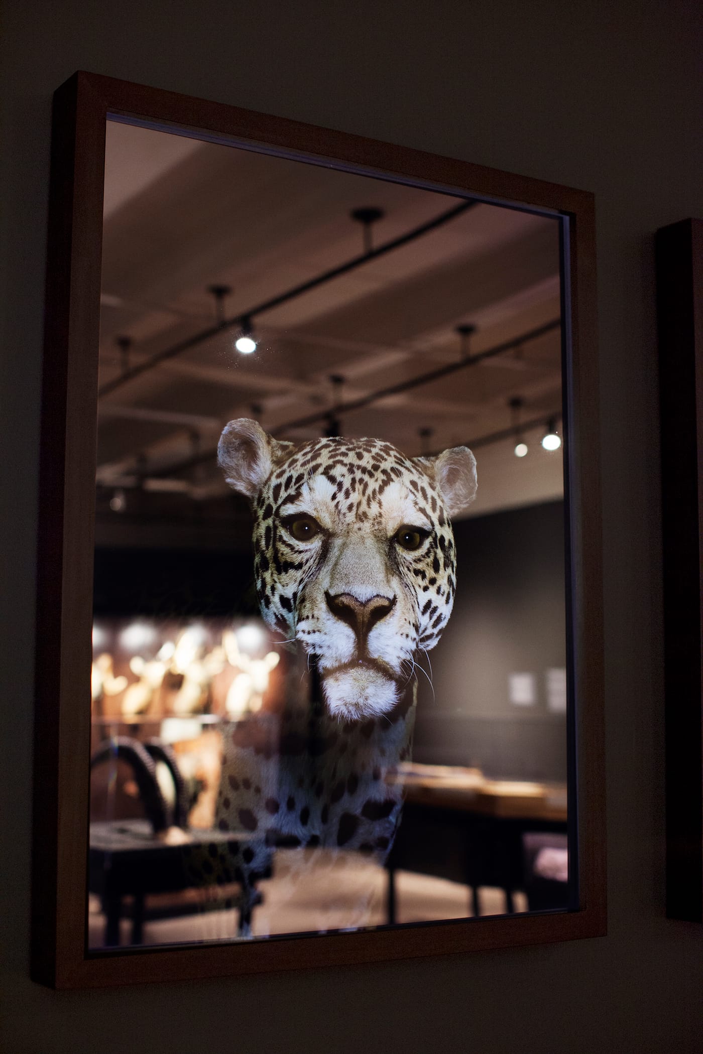 It’s an exhibition that rewards extended time in the gallery, too. Seely created a series of 10 light box Next of Kin Portraits of taxidermy endangered animals on view in HMNH. They gradually light up and fade, so that at one moment the face of a jaguar is barely visible in mirrored glass, while at another point it gazes directly into your eyes. A sound piece by Matthew Patterson-Curry grows more cacophonous as the portraits become more distinct, with human-made noise giving way to the calls of extinct birds. On a nearby wall are Seely’s Species Impact daguerreotypes of animals currently under threat due to climate change in the arctic and tropics, including the snowy owl and American flamingo. As with the light boxes, it’s impossible to look at the daguerreotypes without seeing yourself reflected.