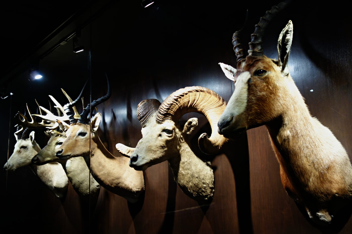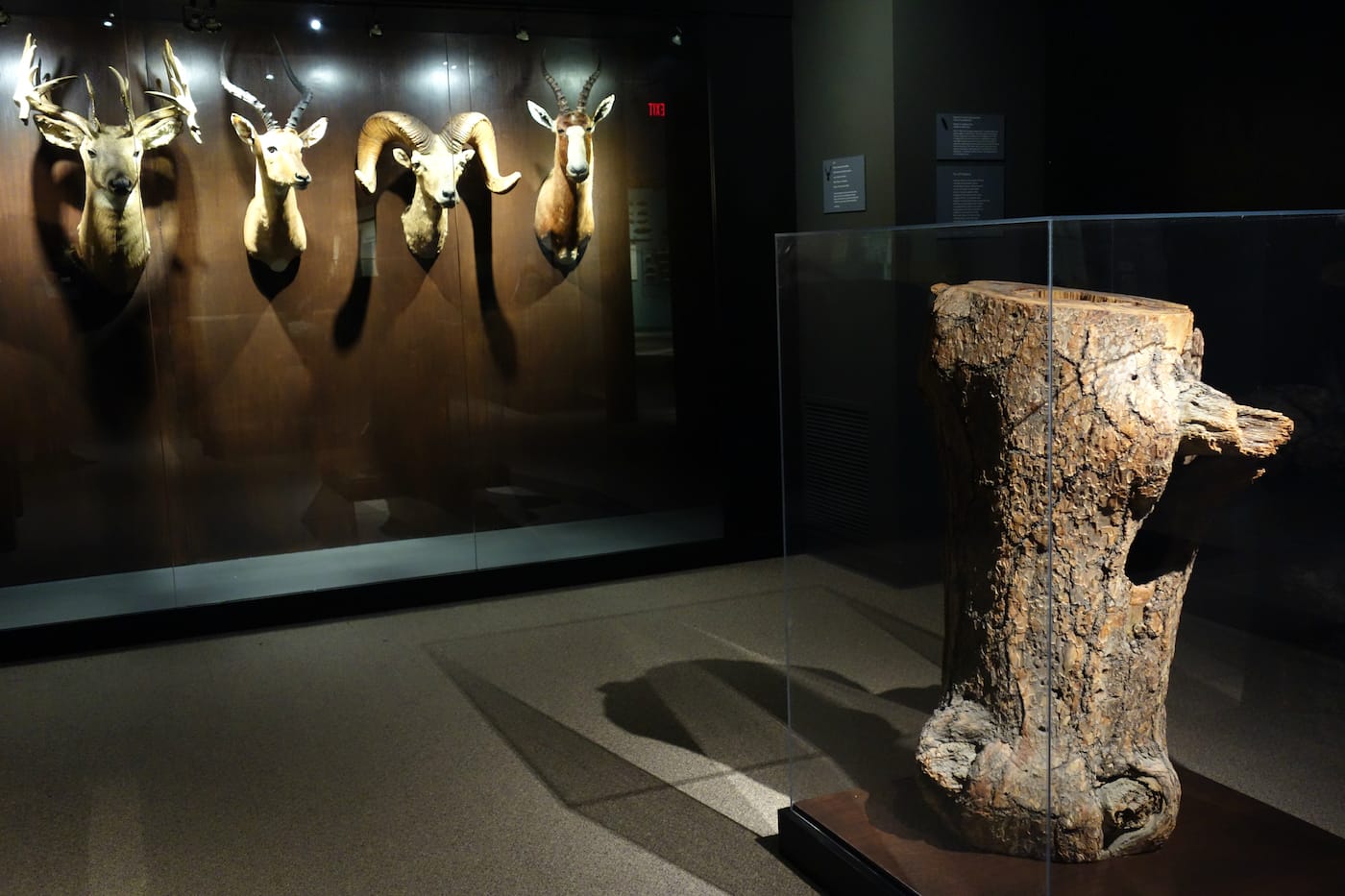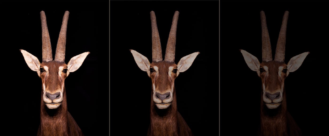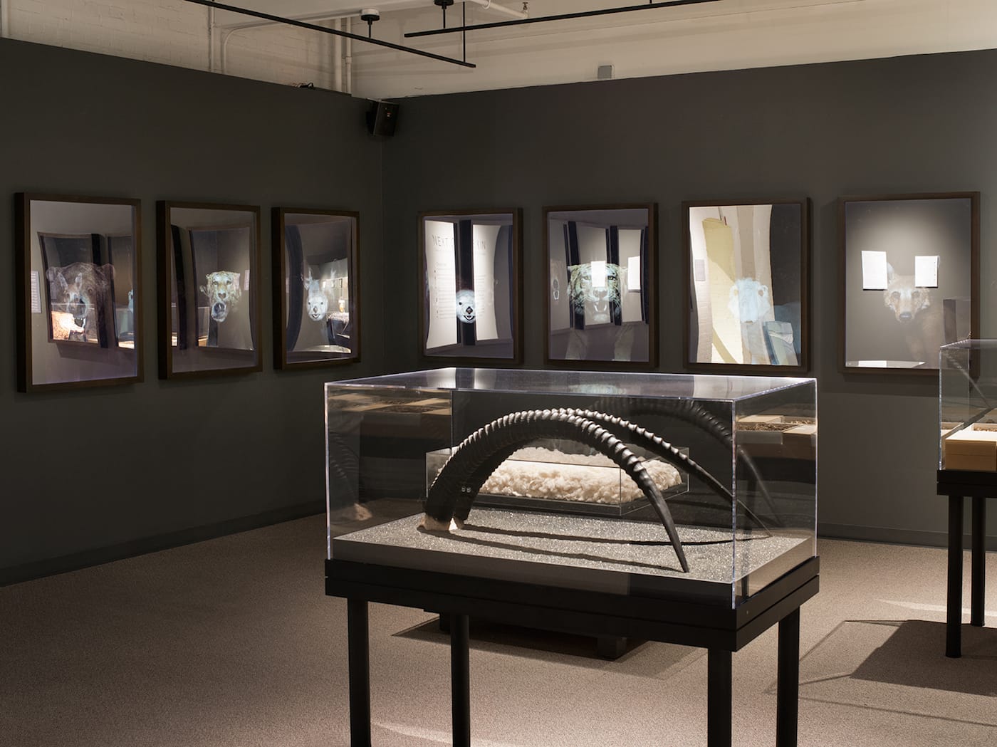 While exploring Next of Kin, under the gaze of Seely’s light box animals and the artificial eyes of a “herd” of animal heads, I was reminded of the Room of Extinct and Endangered Animals at the Grande Galerie de l’Évolution in Paris. Unlike the rest of the French museum, which is brightly lit and lively with schoolchildren racing around the displays, that gallery is darkly illuminated, with taxidermy specimens including the extinct Tasmanian tiger and Schomburgk’s deer of Thailand positioned like specters in glass cabinets. Some, such as the only surviving black emu skeleton, are so obliterated they’re down to fragments. There’s a feeling of being in a hallowed chamber that acknowledges the death of these animals in a way that most natural history dioramas do not.