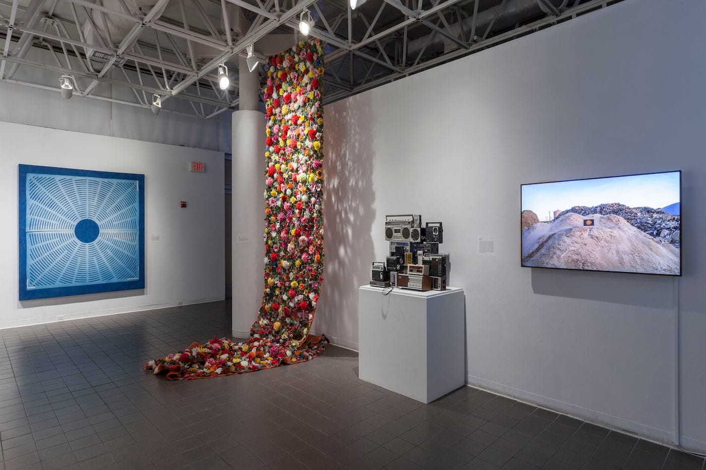 More than a few works in the show brought to mind William Faulkner’s famous lines, from his novel Requiem for a Nun (1951), “The past is never dead. It’s not even past.” Christina P. Day’s sculpture “Frequencies” (2015), which consists of a stacked arrangement of old radios and cassette recorders, reminded me of the day, sometime in the early ’80s, when my older sister bought a boombox at Kmart on the way to the Jersey shore. I inherited it, eventually, and would pretend I knew how to breakdance on my friend’s porch.