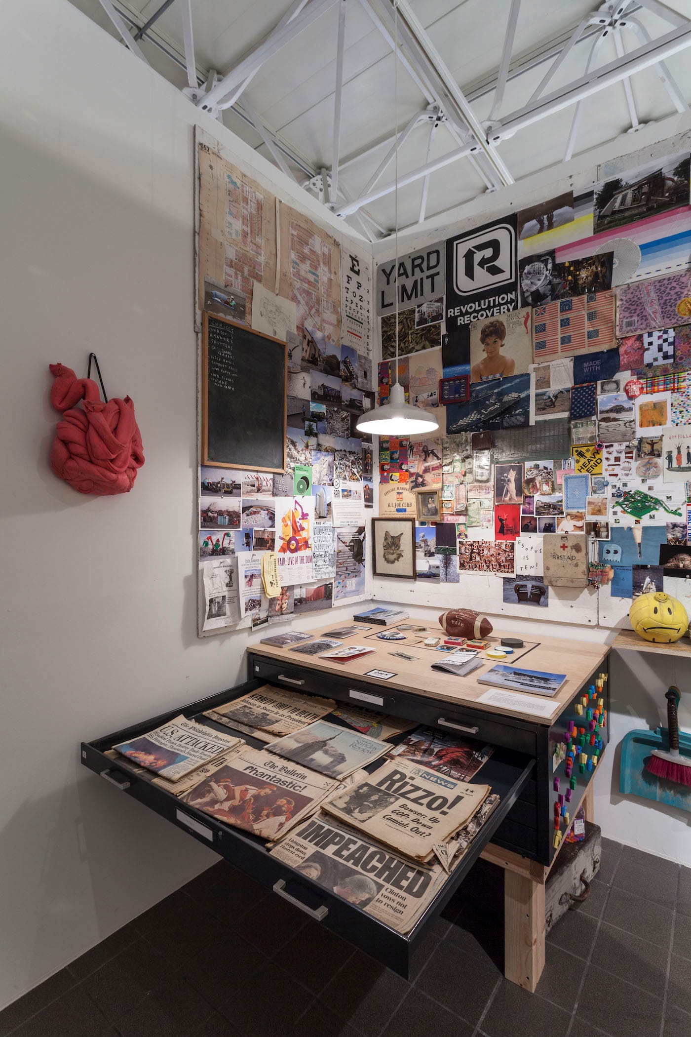In 2010, Billy Dufala, who is also an artist, and Fern Gookin founded the Recycled Artist in Residency (RAIR), in cooperation with Revolution. Since that time they have hosted over forty artists from around the world, providing access to roughly 350 tons of goods that the rest of us throw away. As I mentioned in a piece about an exhibition of Billy and Steven Dufala’s artwork, it’s possible to find anything at the Revolution site, from old magazines to records, beds, and knickknacks. One day, in 2015, Billy encountered a Donald Trump doll from the eighties and moved it into his office. (I wonder if it’s still there.) Dufala’s experiences at Revolution, I wrote, “[force] him to confront the tendency to become sentimental about the objects in our lives.”