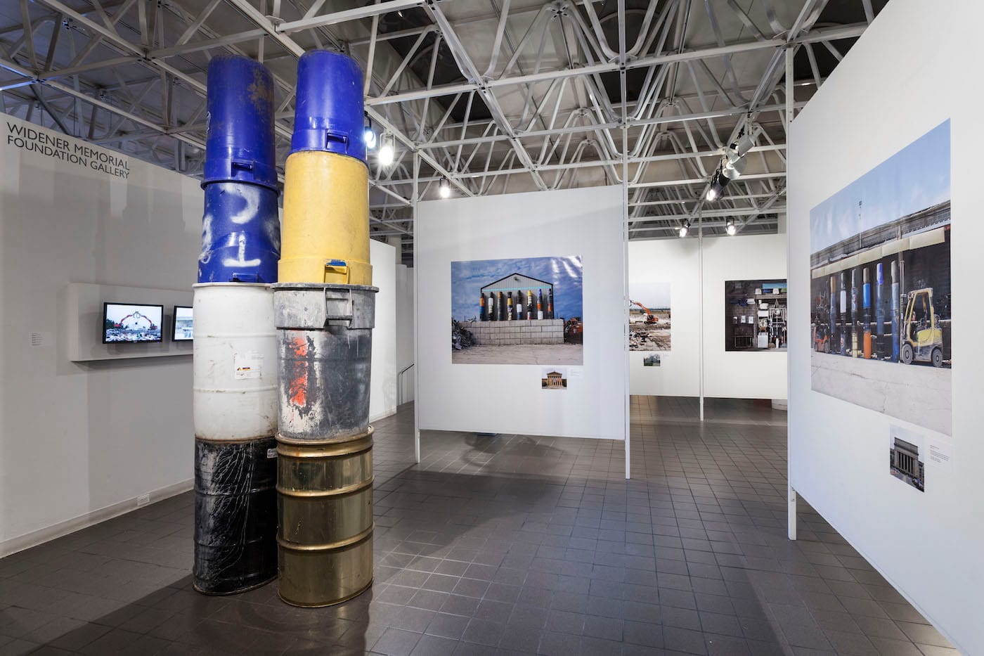 Likewise, Peñalba’s photos ask viewers to reconsider the buildings that define the establishment. “(Re)Production 06” (2016) re-creates the PMA’s Greek columns with stacks of plastic trash cans and 55-gallon drums. The corrugated metal structure behind the columns represents the building. For each re-creation, there is a small accompanying photo of the real thing. The interplay of the two photos offers a contrast between makeshift and enduring materials, creating a humorous tension that upends the hierarchy of the establishment.