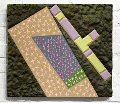 Ivin Ballen’s ramshackle constructions have the tone of DIY abstraction. Their glorious tape lines, padded bulges and hand painted tetris blocks are like a neon sleeping bag for your eyes. At first glance these constructions ooze an enthusiastic, sloppy abandon. Though they project the ethos of devil may care trash art, they are actually cast in resin and painstakingly painted to resemble the tape, paper and padding on which he models each piece. They are sculptures of collage, like Barenboym they echo the original in a way that gains volume. What’s great about these pieces is that they shift in front of you, from sloppy, to cold and calculated, to something in the middle.