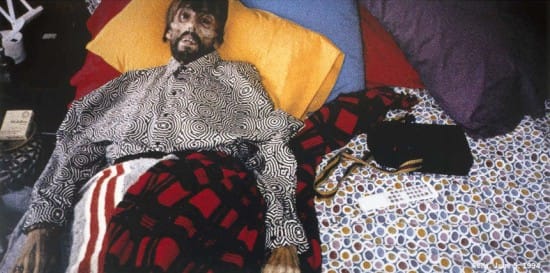 The most horrifying and memorable image in the show is not a crucifix being crawled on by ants, but A.A. Bronson’s photograph of his friend Felix after he died from complications from AIDS. Bronson’s portrait seems like the dark, crushing culmination of the entire exhibition. Celebrated in the beginning of the exhibition, the portrait of the male body is now sunken and drawn and yet, the garish fabric around him, as well as the TV remote, remains, as a friend at the exhibit pointed out, completely camp.
