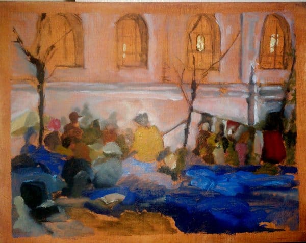 Editor’s Note: Karen Kaapcke is a painter based in New York City. She visited Occupy Wall Street at Zuccotti Park over several days and created a painting each day to document her experience in the park. We asked her to write something short about the work she produced there and her experience in the birthplace of the movement.