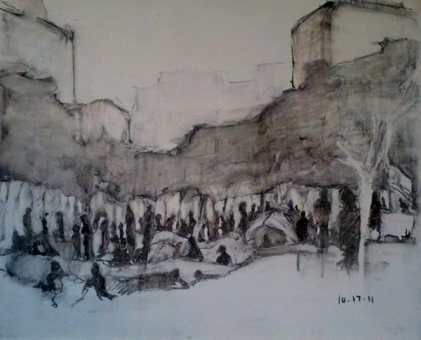 I don’t usually paint among others, let alone in such an active crowd. I didn’t know how I was going to proceed, I just went. As soon as I arrived, I looked around outside the park, scoping out a possible spot where I could set up, but this didn’t seem right. Again, I felt the insider/outsider dilemma. It would’ve been safer to remain outside the park, and it was a much better vantage point from which to paint, but it seemed all wrong. Among other things, it smelled of something like using OWS for my own aesthetic purposes. So I stuck myself inside, participated in every “mic check,” felt the energy and let myself go into it as a painter.
