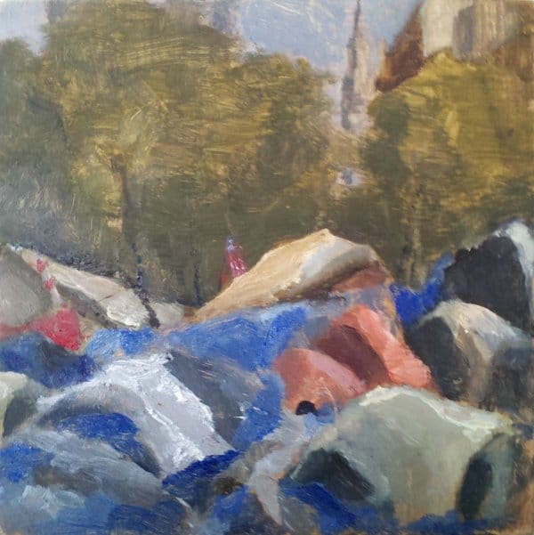 I didn’t want to stand out. I sat with the painting panels on my knees. I had to work fast, given that it was often drizzling or cold. There was very little room for thought. I realized that this kind of documenting had to be a raw kind of response, in order to best capture the humanity of each moment there. Each day brought me a different sentiment as a narrative developed.