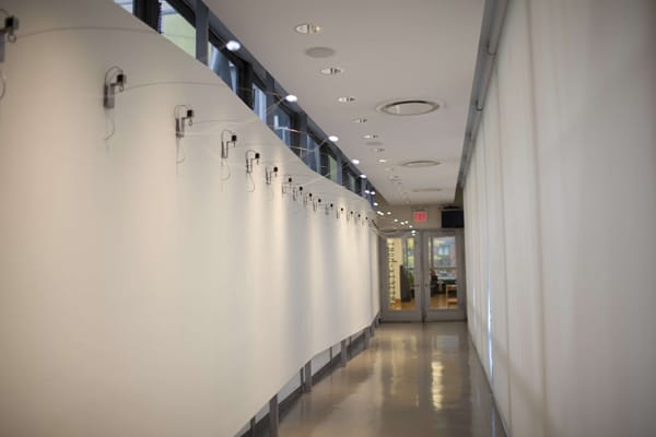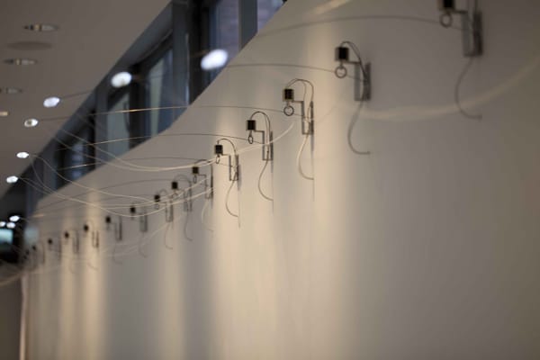 The space of this installation, in a skybridge corridor that is a functional artery of the institution, extends an invitation to simply pass or pace and adds to the experience of Artifix Mori. Its appearance is subtle and playful, but upon exploration it begins to feel rather directive as it gently but consistently interacts with you in the narrow space. Despite if you want to just walk by. This experience would be very different if it were installed in a large room. Both the Skybridge and Artifix Mori call attention to the interconnectedness of simple individual actions and nature through various intermediaries. Our small movement affects a small organic form, halted in its process of becoming. Whereas philosophical thinking is explicitly concerned with the sense of being, the nature of becoming that I take away from this piece feels a bit more like the space of macabre poetry in the guise of its visual presentation. The cocoons wobbly movements feel like animated sound bites on not just editing nature and the tolls of production and consumption, but also the pace of thought. They ask the question on and through this new nature, what are we are all in the process of becoming?