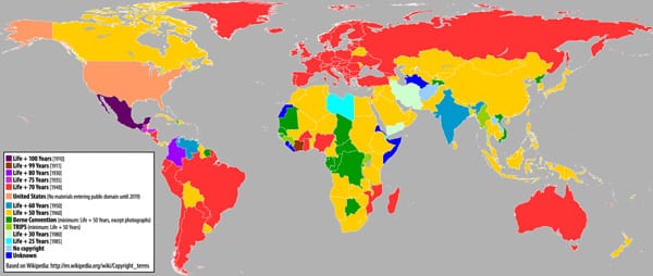Why 2012? You ask. Well, in countries which operate a “life plus seventy years” term for copyright [they are colored red in the map above] dictate that any author, composer, artist or creator who died in 1941 is now copyright free.