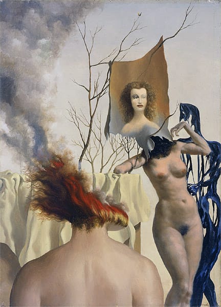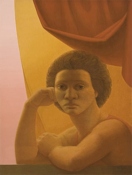 The wall-eyed girl in George Tooker’s “Girl in the Window” (c.1978) vacantly stares at the viewer, as if she were a drowning in an opium haze. The handling of the figure recalls Giotto, but the saturated color palette is strictly 1970s Playboy centerfold. In Federico Castellon’s “Veronica’s Veil,” a woman’s head mutates into curls of flames. This is not just another picture of a woman with her head on fire. She inhabits an unspecified space, which is neither here nor there. This is dreamtime.