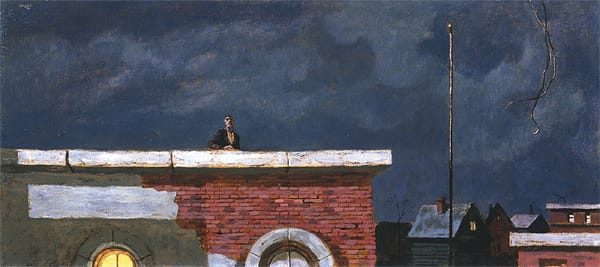 In Hughie Lee-Smith’s stark untitled painting from 1954, a black man in suit and tie leans against the ledge of a tenement rooftop as he overlooks a ramshackle cityscape. By far, this is the most direct painting in the show. Though the picture lacks the pictorial strangeness of its neighbors, the composition is mysterious, brooding. Who is this man, what brought him to the roof, and why?