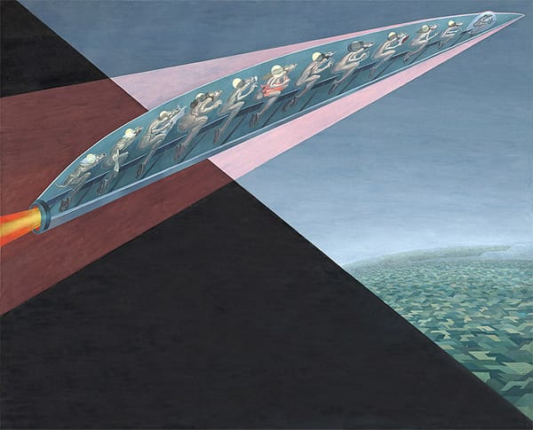 In Irving Norman’s “Flight” (1955), a rocket ship barnstorms across a cloudless blue sky; its nude passengers situated like peas in a pod. In the distance, the landscape recedes from view, becoming a patchwork of geometric shapes. The deliberate tension between pictorial realism and abstraction is severe, which helps to keep the viewer off-balance, uneasy.