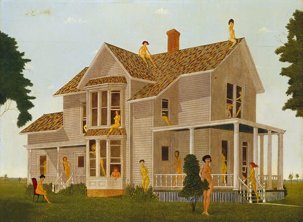 The gaggle of nude women in John Wilde’s “The Wildehouse” (1952) inhabit a large country house; some prance and preen on the roof and porch while others pop in and out of bedroom and bay windows. They appear frozen, almost startled by the presence of the viewer. The picture is as uncanny as it is traditional. In addition to the rogue band of nudists, the colors are too clear, too crisp. I love it.