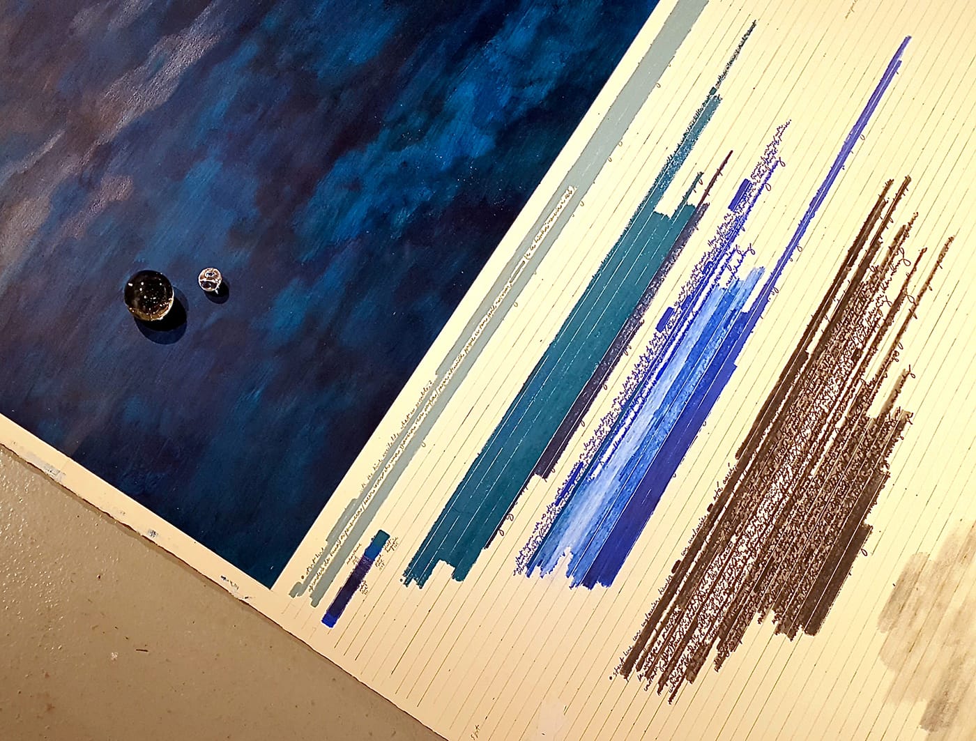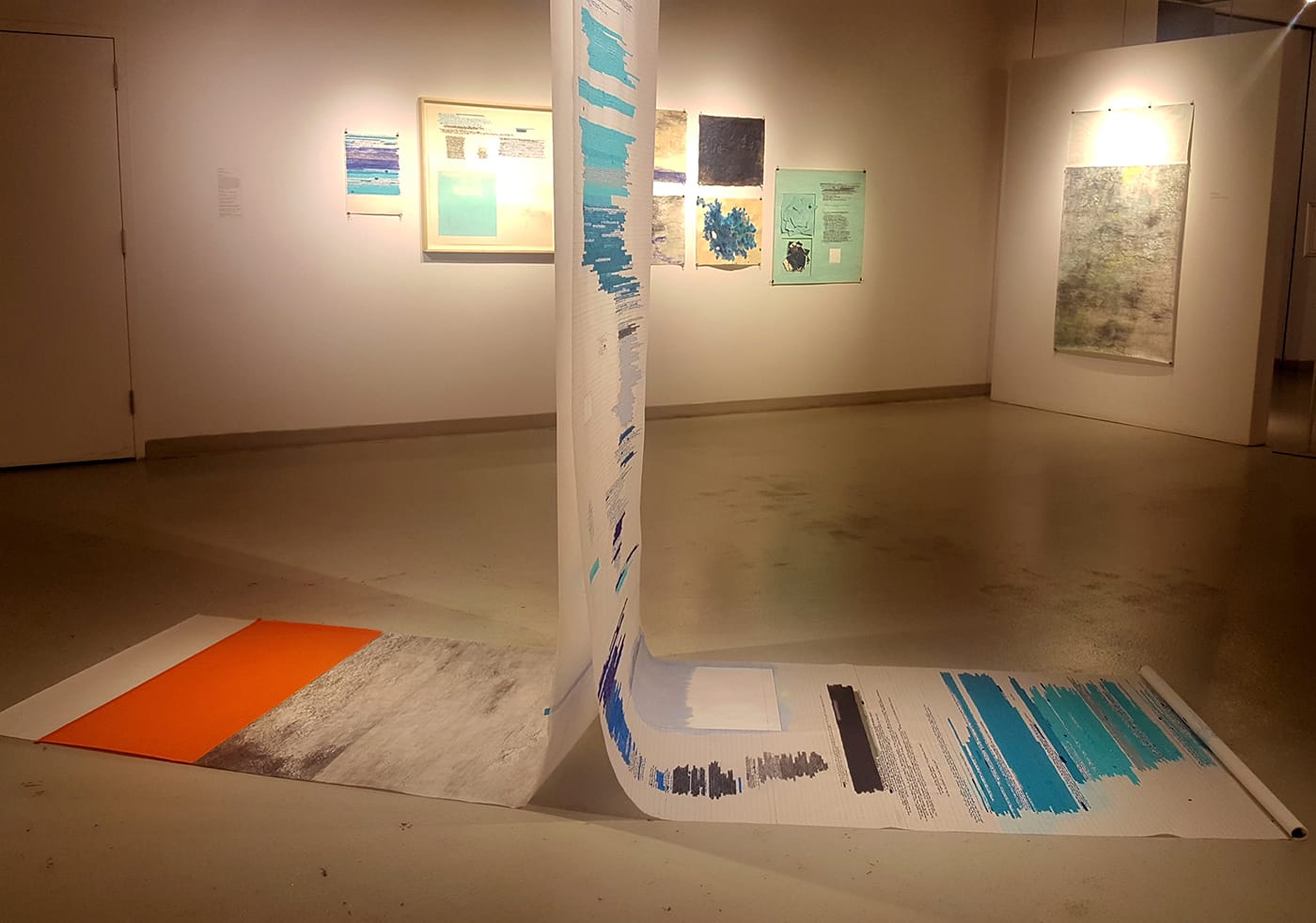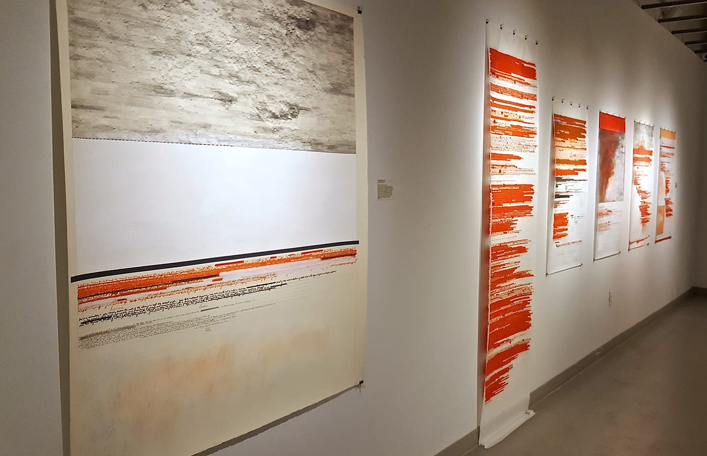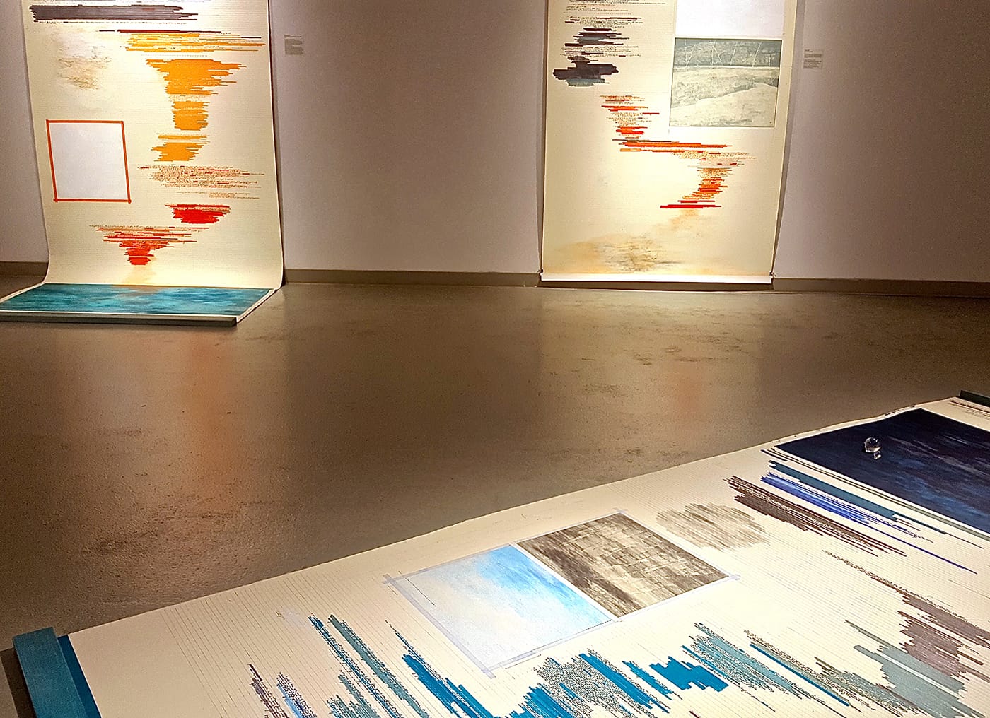 Artist Anne Gilman seems to keenly appreciate the scroll as both a physical and temporal experience; her solo show, Up close / in the distance / now at the Birmingham Bloomfield Arts Center is comprised almost exclusively of super-sized scroll-like works on paper. These hang on walls — or in one case from the ceiling, dividing the space like a legend between her complementary fields of orange and blue — or lay out on a plinth-top or the floor, in one case punctuated by a pair of crystal balls.