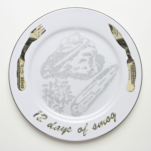 The most interesting art in Swept Away is unpleasant, not in its appearance, but in how it makes you think of just how dirty our world is. For “Steak Dinner in 12 Days of Smog” (2011), Kim Abeles left stencils on a complete dinner set on her roof in LA, for a time ranging from four days to a month. All were marked with ghostly images from the accumulation of smog.