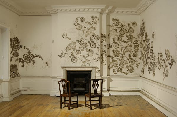 Catherine Bertola also has an installation that has a lifespan the length of Swept Away. “Unfurling Splendor,” similar to her “The Property of Two Gentlemen” (2006) shown above, has dust from the museum’s floor stenciled with glue in an ornate wallpaper on the white gallery wall. If you are squeamish about dirt and the stray hairs that make their way into it, don’t look too close.