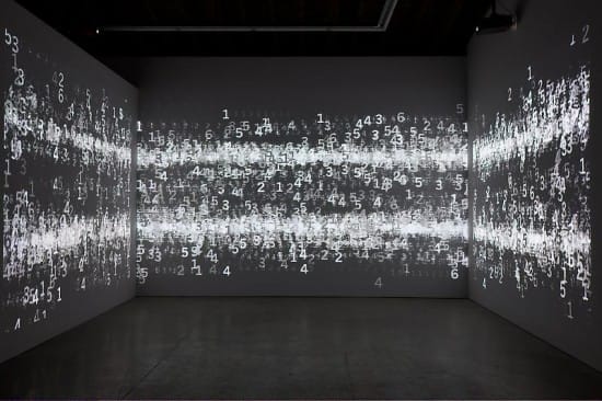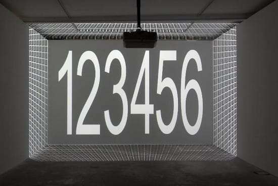 Starring at black walls projected with white numbers filled the warehouse space, the exhibition contained three works, Painting by Numbers, 14352 and Plato’s Alley, which were, at least in the crowded opening, almost indistinguishable from each other. Without the camp, color and dynamism of Atlas’s earlier works, I couldn’t help but feel extremely let down by the exhibition.