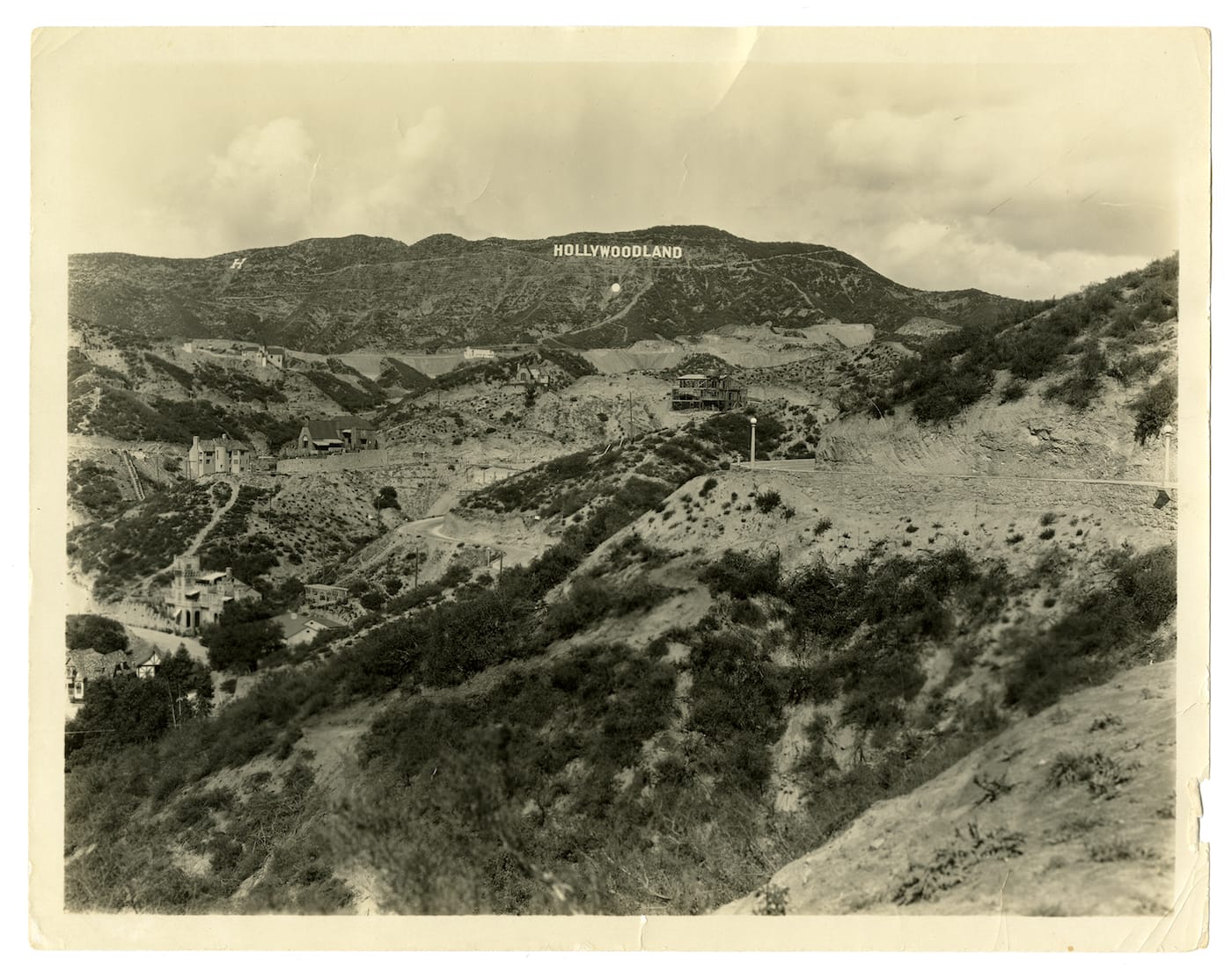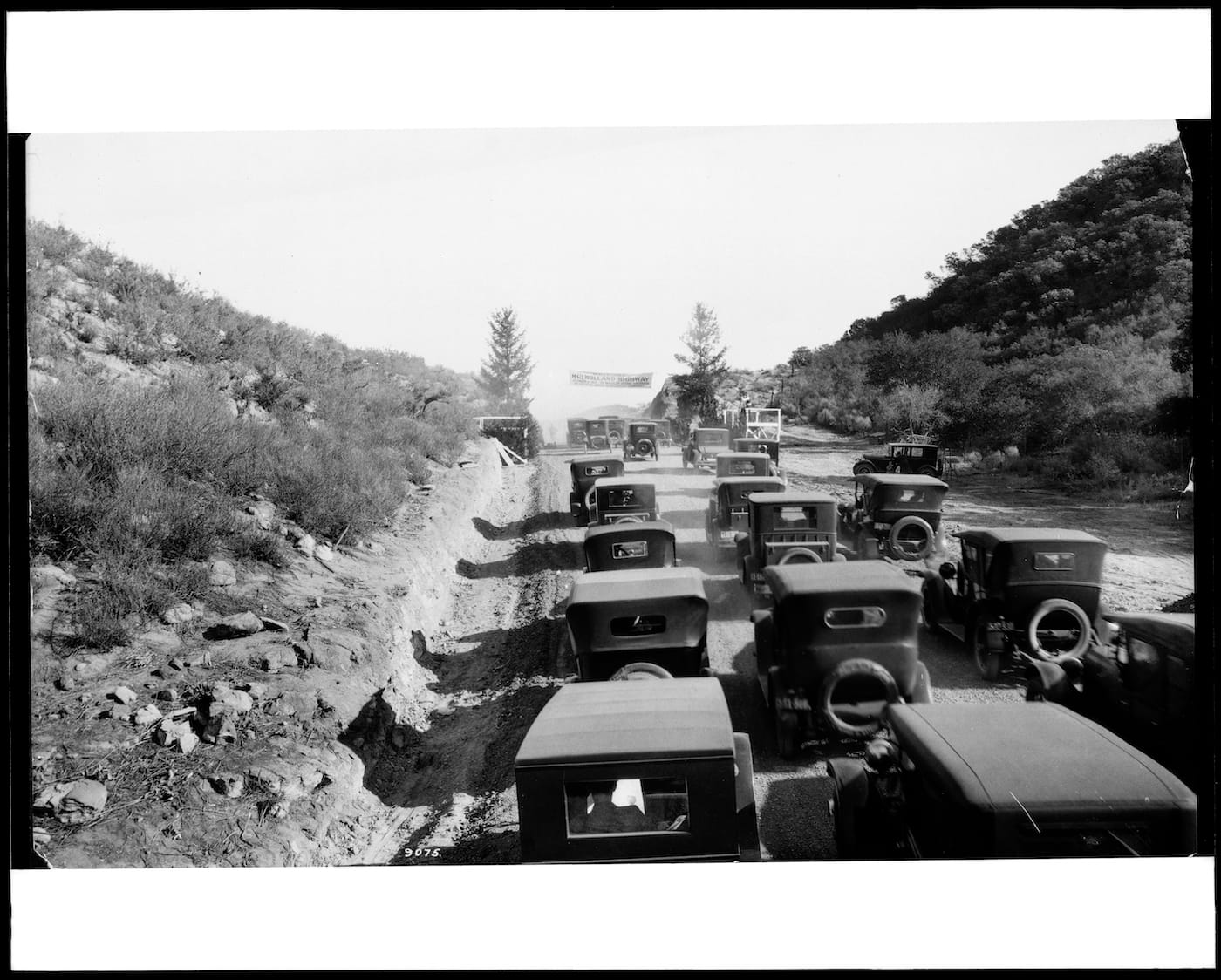 In Los Angeles, after the railroads came in, it took the city a while to figure out its infrastructure, but once it started growing, it grew explosively, presenting itself as a sort of a tropical oasis. There are several photos of the 1920s housing development, Hollywoodland — where the city’s iconic sign came from. One photo shows LA’s early car culture: a traffic jam of Model A cars waiting for the opening of Mulholland Drive in 1924.