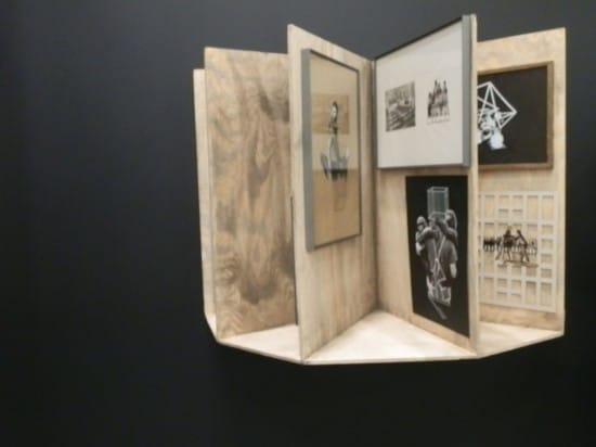 Even though I learned to love Sperini’s works, the pieces that I deeply responded to were the ones which required no supplemental explanation, such as Czech artist Eva Kotatkova’s dark and playful take on constructivism for Meyer Riegger. A fascinating installation with multiple collages on wire sculptures, opened wooden books and the walls painted black, “Re-Education Machine” was unquestionably the most fascinating piece in the fair. While her Czech-background and birth during the Velvet Revolution certainly illuminates the work, it was not completely necessary to understand the criticism of education and politics projected by the pieces.
