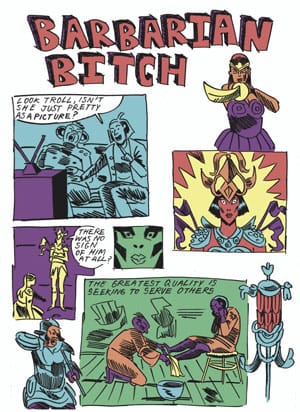 Anya Davidson’s very smart contribution, “Barbarian Bitch,” functions the opposite way, making a pastiche of a handful of narratives in order to arrive at a common ending: a troll and a woman watch a TV movie about a warrior woman pursuing her nemesis amid what could be the highways and bars of 80s Los Angeles; the troll falls asleep, dreaming about playing basketball with a man’s head; the TV movie’s action progresses with ever-increasing brutality. The film’s narrative, interlaced with the troll’s trollish behavior, is counterposed by panels illustrating the central tenets of Buddhism. These calls for mindfulness and inner balance initially read as non sequiturs, sprinkled as they are throughout the plotlines of the movie warrior and the troll, yet they eventually begin to call forth thematic similarities between fantasy/action and morsels of reflection, producing a kind of koan on the nature of power.