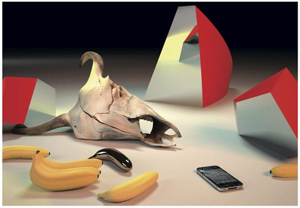 Resembling mixed media installations, Takeshi Murata’s still life photographs, which make up his contribution, Get Your Ass to Mars, are a mix of high, low and the preposterously offbeat. Most contain unambiguous genre references (VHS boxes for horror flicks Dawn of the Dead, Exorcist II, Terror at the Opera) as well as suggestions of a lurid techno-modernity (a cracked iPhone, multiple mirrored surfaces, plastic objects meant to look like real food); all elements are simultaneously forward-looking and antiquated. In one image, a copy of Douglas Davis’s 1973 book, Art and the Future, lies alongside a stepped pedestal littered with eggs, fingerless driving gloves, a pot pipe, and a couple oranges — objects that metaphorically or symbolically express potentiality: temporally, spatially, or existentially. Atop the pedestal is a metal skull akin to that in Terminator, a film that projects the future into the past. But the microphone that rests near the skull troubles the arrangement. Is it now a pedestal or a stage? How much future imagining is pure performance? I wondered, too, whether the photographs in this series were meant to be read as such; that is, as a sequence of images describing an abstract narrative. In this sense, Murata becomes, in the manner of Philip K. Dick, a kind of “fictionalizing philosopher,” whose surreal metaphysical tale rests on shifting perceptions and simulacra.