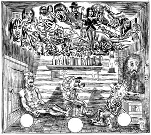 Gary Panter, the book’s lead entry, is its presiding spirit: He’s been creating pop-genre hybrids for decades — his eighties strip Dal Tokyo, for instance, is a détournement of Japanese monster movies, Texan self-mythologizing and alien worlds — and his multifarious output is reason enough to abandon the neat categories that seek to organize artistic movements. In the Jimbo strip for Kramers, Panter gleefully upends aspects of capitalist enterprise and commercial consumption amid a culture and landscape laid waste. Jimbo travels with his friends to a big-box store called Love Chunk — a bright, clean shopper’s paradise set against the mud and rock of the surrounding nocturnal landscape. Love Chunk, Jimbo explains, produces “many products from one muscle cell pool,” but on their arrival at the store, the trio discovers that it has been anagrammatically reinvented as Hulk Coven, whose one product is derived from “many cell pool variants.” The tale’s ending depicts the horror of modern malaise: the trio lies slack-jawed and dumb, overloaded by an endless variety of choices.