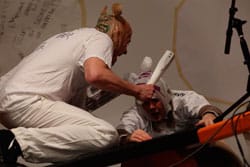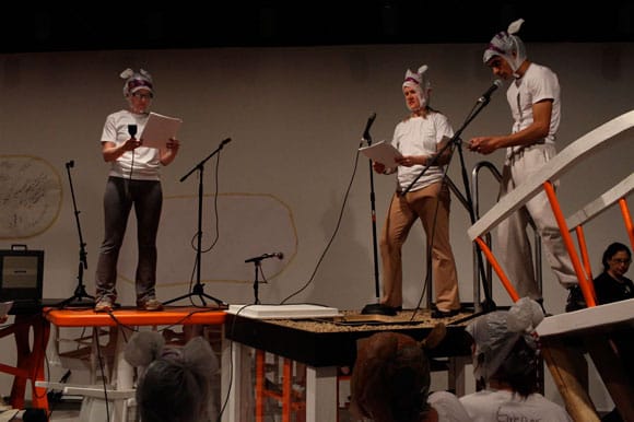 Melinda didn’t go any further in that direction, pretty much staying true to the text. After she’d gotten her auditioners suited up — awkwardly, in full view of all as part of the public (non)-performance — and had each of them mark up with a sharpie their own headshots which had been casually affixed on the wall (to make their images look more like a mouse), she spoke down to the “mice” crouched below her from atop part of Martin’s piece. From this perch, she gave her performers — and the dozens of folks there that were her audience — a spiel about what the whole event was supposed to be. It was done in a voice that managed to sound at once firm and tentative, and kind of weakly amplified through one of the several microphones that were part of the staging ground of Martin’s piece.