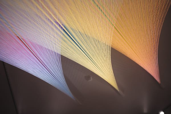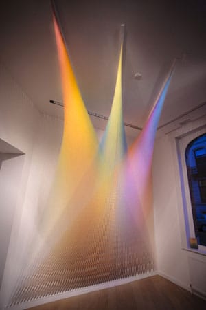Dawe himself sees more than just an ethereal rainbow in his work of art; he sees hours of tiring work realized. “I jokingly say that the installation process is like an endurance performance piece à la Marina Abramović,” he told me. Dawe creates most of his installations alone. Wooden structures with attached hooks are placed on the walls. The hooks act as anchors for miles and miles of thread, the placement of which Dawe has planned ahead of time. “While I’m installing, I’m literally dealing with thousands of threads, so I need to keep my concentration on where I am within my counting system. The whole process is very Zen, or like active meditation.”