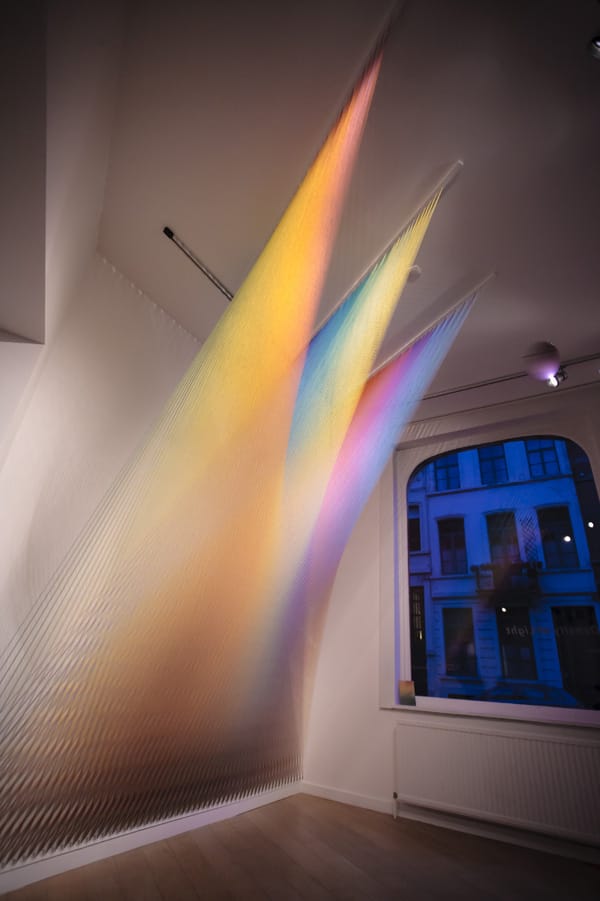 Repression has a way of resurfacing with a vengeance, and nowhere is this more evident than Dawe’s Plexus series, large-scale environmental installations that take regular sewing thread and blow it up to an immense architectural scale. In his latest exhibition, The Density of Light, Dawe has used 51 miles of thread and over 54 hours to create “Plexus 13” and “Plexus 14” at Lot 10 gallery in Brussels. The result is a mesmerizing structure that completely dominates the small gallery space.