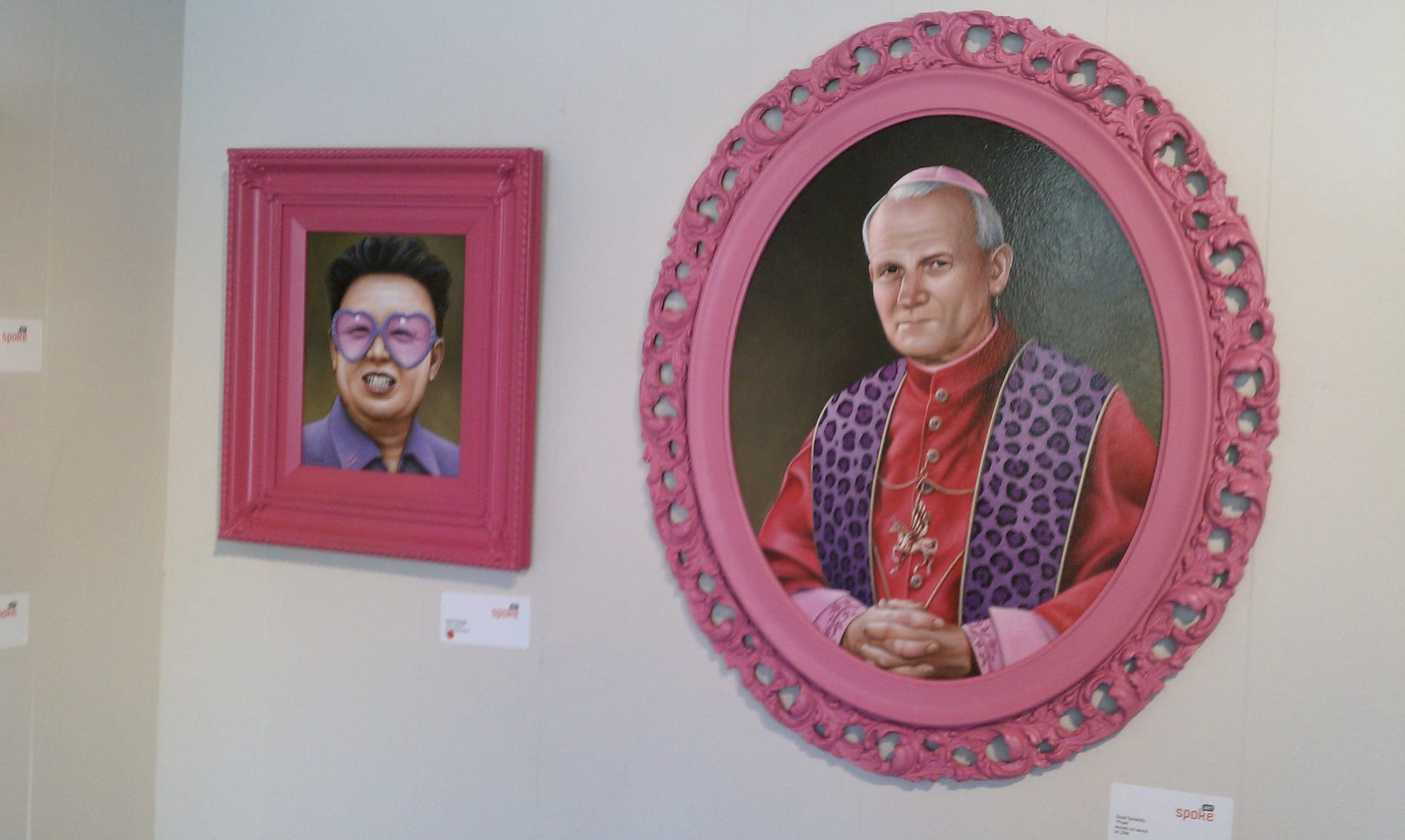 In the nearby Spoke Art Gallery guestroom, Scott Scheidly’s Portraits series of oil paintings depicted some of the world’s most famous authoritarians — Joseph Stalin and Kim Jong-il among others — in emasculated pinks and violets. One visitor to the gallery, however, took offense to Scheidly’s potrayal of Pope John Paul II wearing leopard-print regalia.