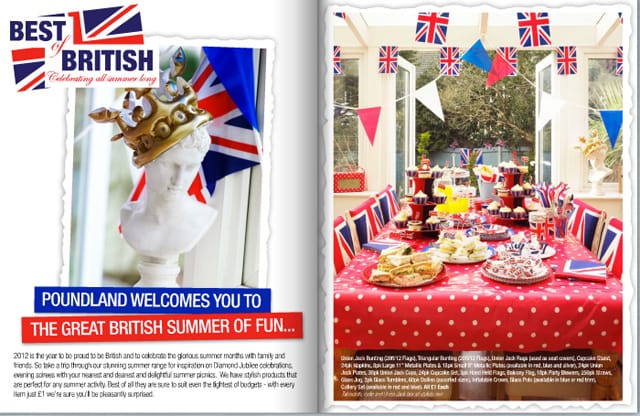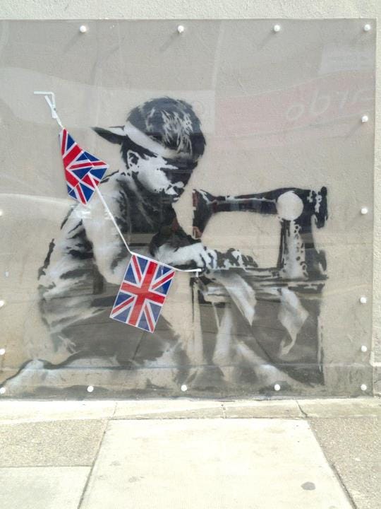 Classing up the joint at 51 High Road in London, Poundland‘s facade now sports an image depicting the slave labor that goes into making the sort of cheap jubilee merchandise that sells in chains like theirs for a pound per item.