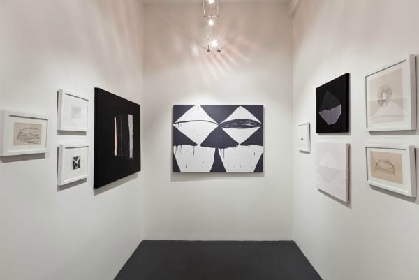I’ve been a fan of Feldman’s art for some time. When I walked into this small space I had to resist the urge to generalize: at first glance, the show might look like the work of one artist. Indeed, Shindler’s black-and-white oblong geometries certainly belong to a similar wavelength. Looking at her ink drawings and acrylic canvases, you see a meandering cluster of delicate lines. They cut the space with a timid grace. Her delicate tendrils offer a subtle, almost naïve counterpart to Feldman’s playful swagger. There is a power here, a sort of unfinished naturalism that suggests something equal parts ancient and man-made.