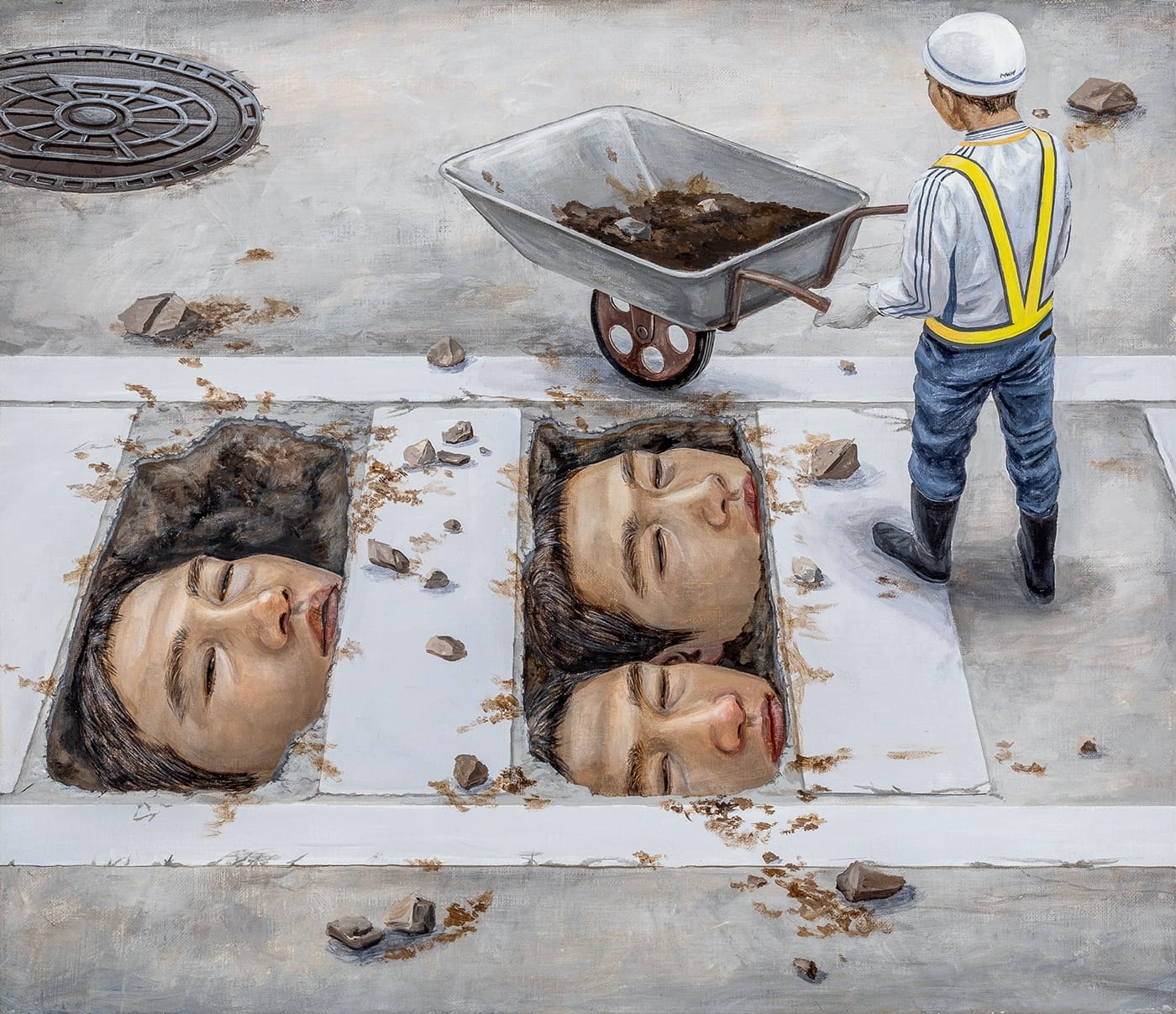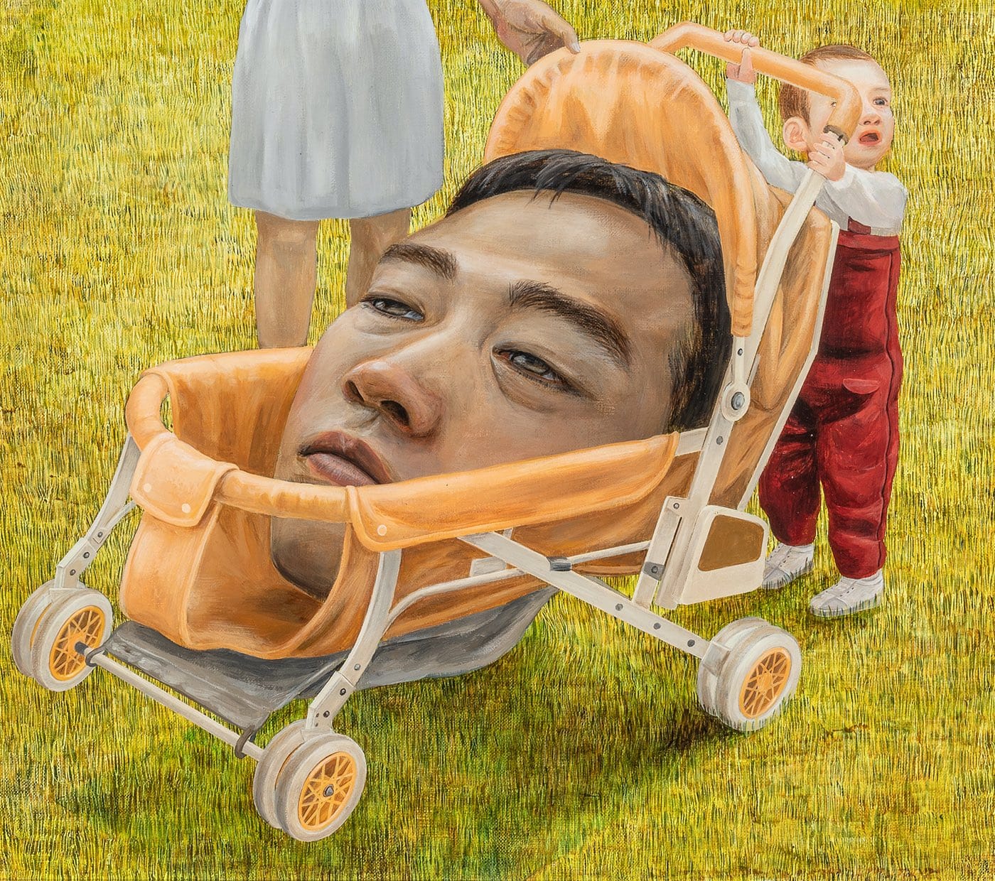 Most of Ishida’s images feature anonymous Everyman figures whose faces, some observers have pointed out, resemble the artist’s own. Three of them eerily pop up from under the pavement at a crosswalk in “Kōkyōbutsu” (“Public Property,” 1999, acrylic on canvas), while in “Kyūka-chū” (“On Holiday,” 1999, acrylic on board), an infant pushes its own baby stroller, in which Daddy’s big lump of a head rides solo, like a soccer ball, its eyes gazing aimlessly into the distance. The message here, in case it isn’t obvious enough: the still-unformed, vulnerable child is the father of the angst-ridden man.