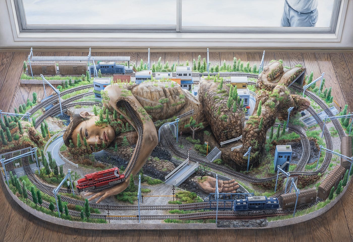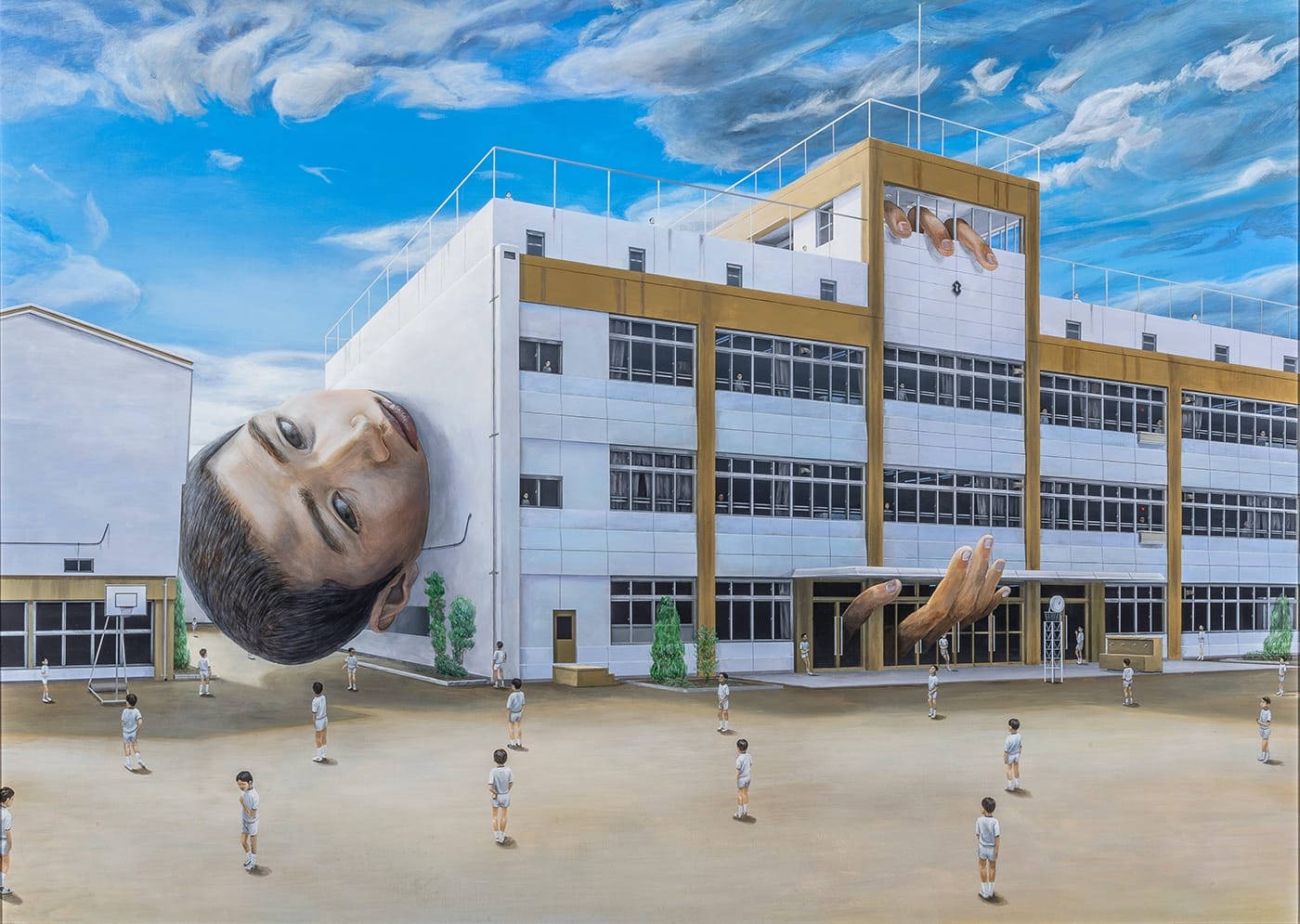In “Shūjin” (“Prisoner,” 1999, acrylic on board), a young boy’s Brobdingnagian body fuses with an ordinary school building, its big head sticking out of one end of the structure to observe other children performing well-regimented calisthenics on the playground. Ishida certainly knew where the soul-crushing began in the society that had shaped him.
