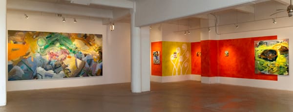 The most dynamic pairing in the show is between Vilim and Fox. At first glance, I did not think Vilim’s “3D-2D” (2011) and Fox’s “Loaner” (2011) had much in common. “3D-2D” resembles the arcade game Q*bert from the early eighties, with its funky isometric shapes. “Loaner,” in contrast, looks like LSD-tinged syrup. Vilim works in the vein of Russian Constructivism, painting flat, vibrant geometric shapes, which seem to float as much as sizzle on the picture pane. Fox, on the other hand, uses a pipette to dispense controlled bursts of color onto the canvas. From afar, the droplets form a shimmering field of light and color. On closer inspection, each buttery droplet feels like a universe unto itself. The hand of the artist unites these two painters. Neither Vilim nor Fox rely on masking. Both artists have a penchant for bright colors, which they mix and match on the palette before a single mark is made.