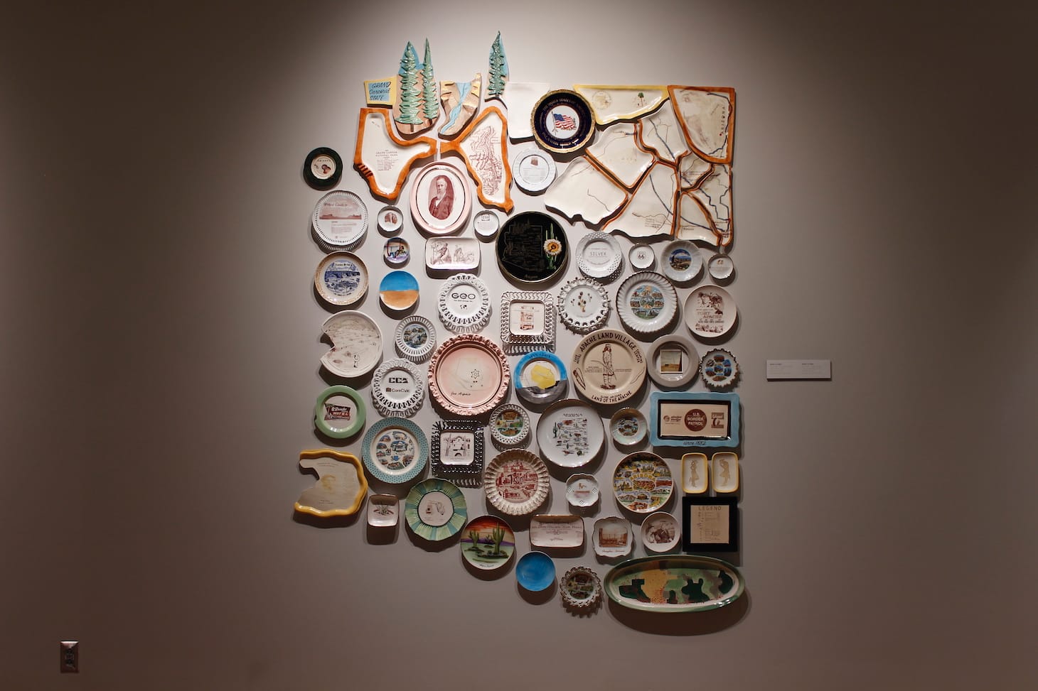 The prison-industrial complex is addressed in crider’s wall installation “Arizona — The Grand Carceral State,” an array of 66 commemorative plates, 15 of which are commercial souvenirs crider gathered, and the rest are ceramic imitations she created. Their imagery ranges from tourist kitsch about the Grand Canyon, to incisive commentary on WWII internment camps, the anti-immigrant sheriff Joe Arpaio, and related issues. While the installation’s shape in the state outline may be a bit heavy-handed, its operative confusion of actual versus fictitious objects feels like a crucial caution against normalizing such dehumanizing actions and policies.