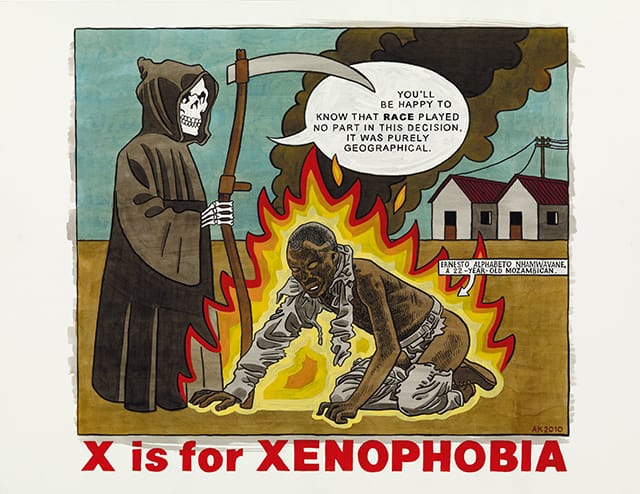 A series of prints titled The Alphabet of Democracy, which mimics a children’s alphabet with each letter standing for a word or phrase, evidences Kannemeyer’s new scope: “M is for Mugabe,” “X is for Xenophobia” and “S is for Stompie” (Stompie Seipei, a black teenager murdered by the thugs in Winnie Mandela’s football club–cum–vigilante gang in 1988.) The series is as frightening, funny and effective as any of his best work.