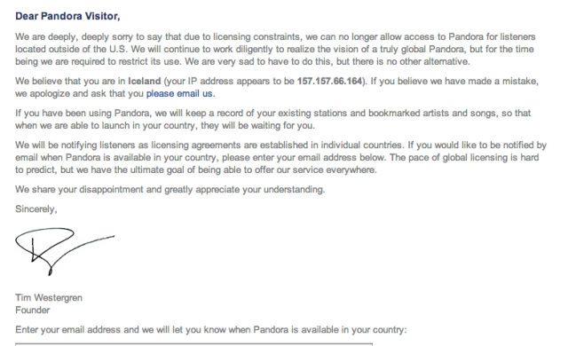 Pandora doesn’t work here in Iceland. Nor does Netflix. The country doesn’t allow either, so my friends and I have all been swapping music and movies instead of streaming them. My friend who gave me the songs I am listening to right now got them through the Bittorrent hub Piratebay. I’m listening to London music from a Philly girl while living in a farmhouse in southern Iceland, all because the internet is slightly less global than I thought. It’s a strange world.