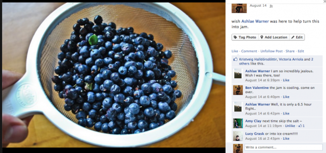 I am paranoid that those bikers think that I am online too much, that I need to stay present to “reality.” Like my job isn’t real life, like their bikes aren’t enabling a constructed experience of nature, like their flight to and bike ride around Iceland was totally natural. It is true though, I post to Facebook often, er, we post to Facebook often. But I did enjoy myself in Iceland! I saw the puffins, the northern lights, heard the music, and I picked berries. Look, I totally was here, in the dirt and woods, picking berries, look you slow bikers:
