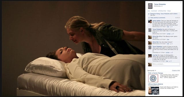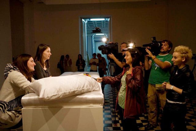 On September 5, the first Sleeping Beauty in Polataiko’s exhibition awoke to a kiss from another woman. Both of them were surprised. Polataiko shot photos of them laughing and looking at each other. Then he posted the images to his Facebook profile, where he has been live-blogging the entire event. Now the Sleeping Beauty must wed her “prince,” thus queering the historically heteronormative fairtytale. Gay marriage is not allowed in the Ukraine, however, so these two women will have to wed in a European country that does allow for same-sex marriage.