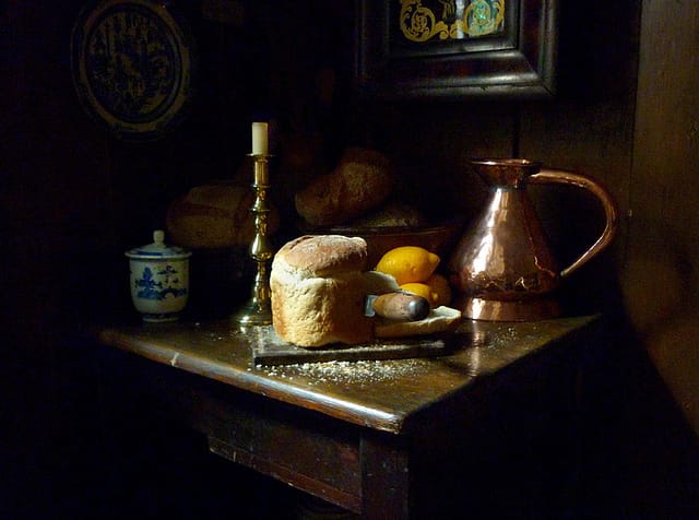 Severs lived in the house from 1979 until 1999, when he died at the age of 51 from cancer. While he embraced and lived his day-to-day life immersed in English history, he was born in California, where at a young age he was drawn to what he called the “English light,” particularly in the works of the Old Masters. When he finally got to London, he acquired a derelict house at 18 Folgate Street, and for the next two decades worked to bring that Old Masters illumination to life. He did this through a careful arrangement of objects and light, and also sounds, smells, and even tastes elicited by the sight of half-drank wine or bread crumbs scattered from a torn loaf.