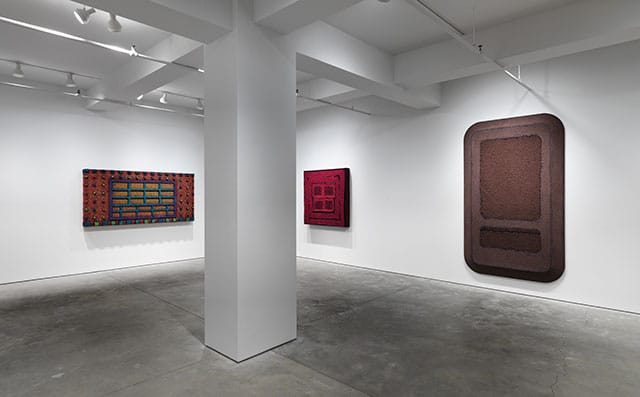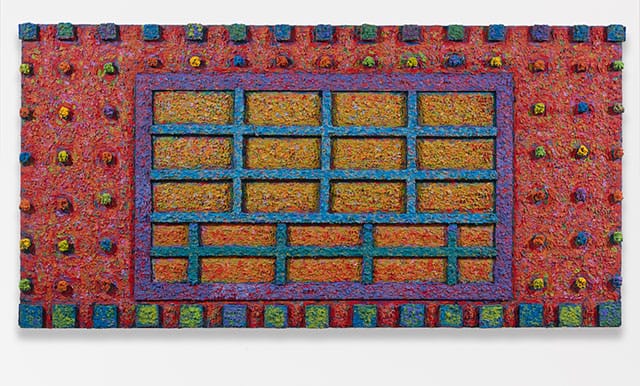 Made up of a mix of colors — red and blue, for example, or pink and green — the paintings’ encrusted surfaces glow. Their rough tactility evokes the effects of time, as well as a thing’s deep persistence. At what point does something become so encrusted that it loses its identity? Humphrey seems to be betting that perseverance will win out, that painting—no matter how caked with the sludge of time — will still manage to smolder.
