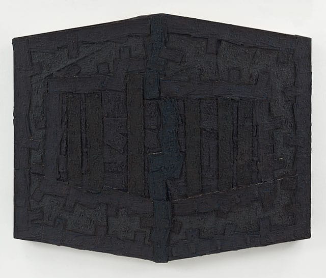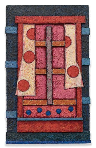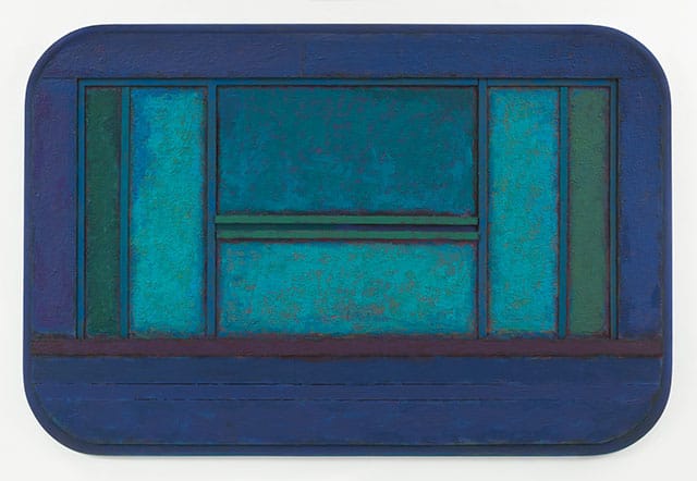 With its rounded edges, “Untitled” (1973), the earliest painting in this exhibition, resembles the cabin door or bulkhead hatch on an ocean liner. This would justify why it is hung just above the floor. (Humphrey’s humor is quiet, but precise and even tender). He has used modeling paste to give the painting’s surface an uneven, stucco-like feel. The paint is not acrylic or oil, but casein, a fast drying medium that comes out matte. The palette consists of four different tonalities of brown.