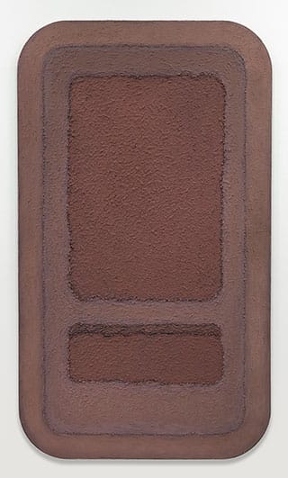 There is a frame running around the edge of “Untitled.” Within the frame’s rounded rectangle, Humphrey paints another frame of nearly equal width on a slightly rougher surface. About a third of the way up from the interior frame’s bottom edge, a band joins the sides, dividing the interior into two different-sized rectangles. The upper one is vertically oriented and echoes the painting’s shape, while the lower, horizontal one is considerably smaller. Humphrey has also added a thin strip of darker brown along the band’s bottom edge, turning it into a palpable structure, a literal frame in which the smaller horizontal rectangle seems to have been inset.