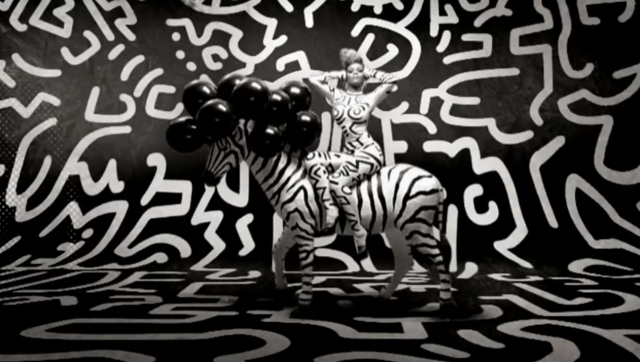 I was really inspired to start looking for examples of this cultural collapse when I saw Rihanna’s music video for “Rude Boy.” In it, the singer had several obvious nods (like the one seen above) to pop artist Andy Warhol, especially his “Marilyn Monroe’s Lips” (1962). Rihanna also makes a great reference (see below) to Keith Haring‘s intricate drawing style and body-painting practices (see this photograph by Annie Leibovitz for comparison).